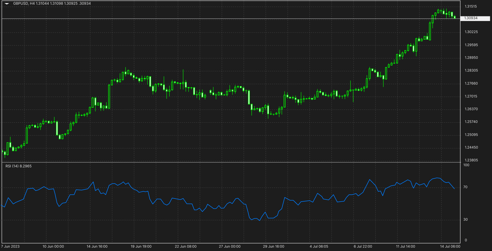 When the RSI line crosses and moves up above the oversold line (30), the RSI indicates a potential buy signal. When the RSI line crosses below the overbought line (70), the RSI shows a potential sell signal.